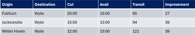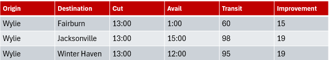 - Jacksonville and Winter Haven transits will both improve 39 hours.